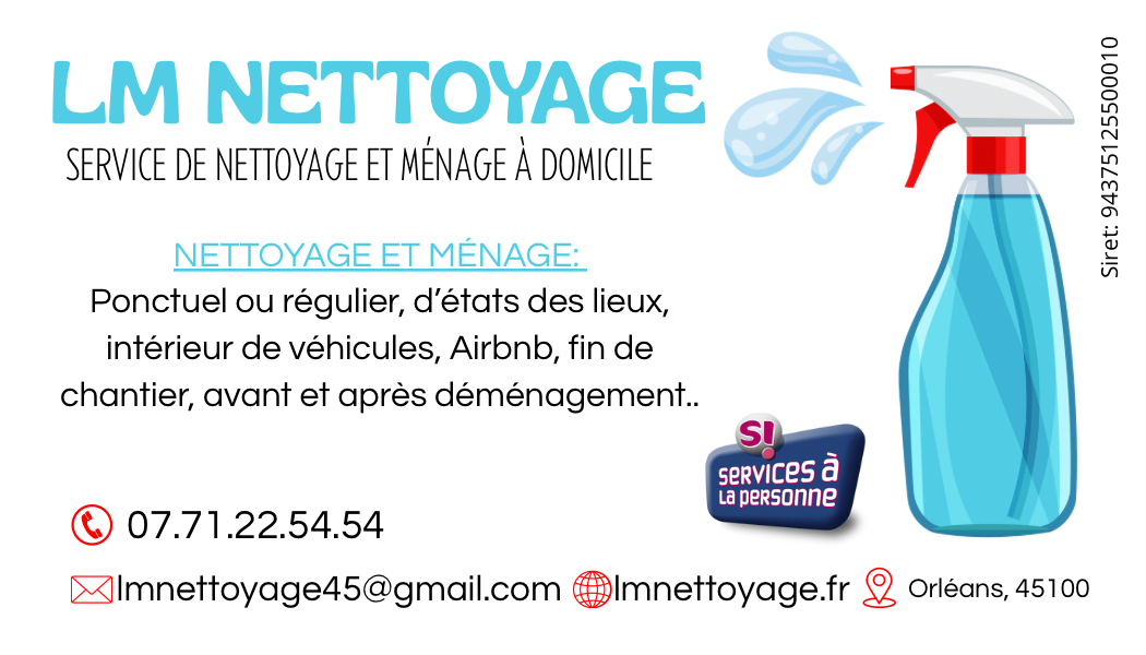 LM nettoyage offre des services de nettoyage et ménage pour les particuliers, basé à Orléans (45). Notre équipe qualifiée est prête à répondre à tous vos besoins de nettoyage et ménage à domicile.